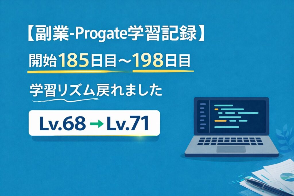 Progateを始めて6か月半。現在185日目〜198日目の学習記録です。 前回(138〜184日目)は年末年始でほとんど進まず、Lv.65→68で足踏みしていました。 そして今回。 Lv.68→71へ。 レベルが上がったことも嬉しいけれど、いちばん大きかったのは、 学習時間を... -